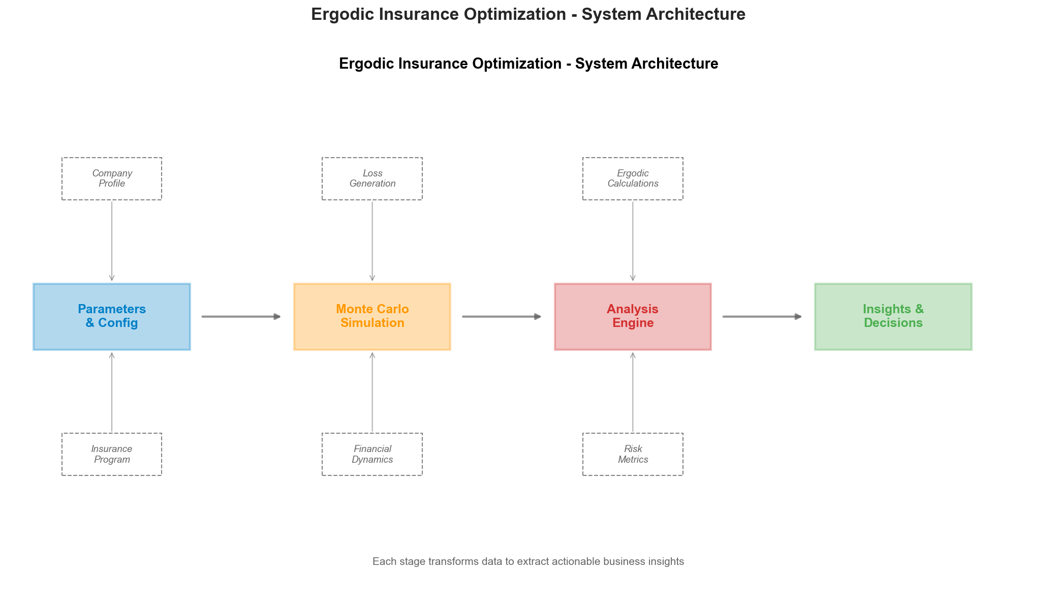 This section provides comprehensive architectural visualizations of the Ergodic Insurance Limits system using interactive Mermaid diagrams. These diagrams illustrate the system’s structure, module relationships, data flows, and design patterns.