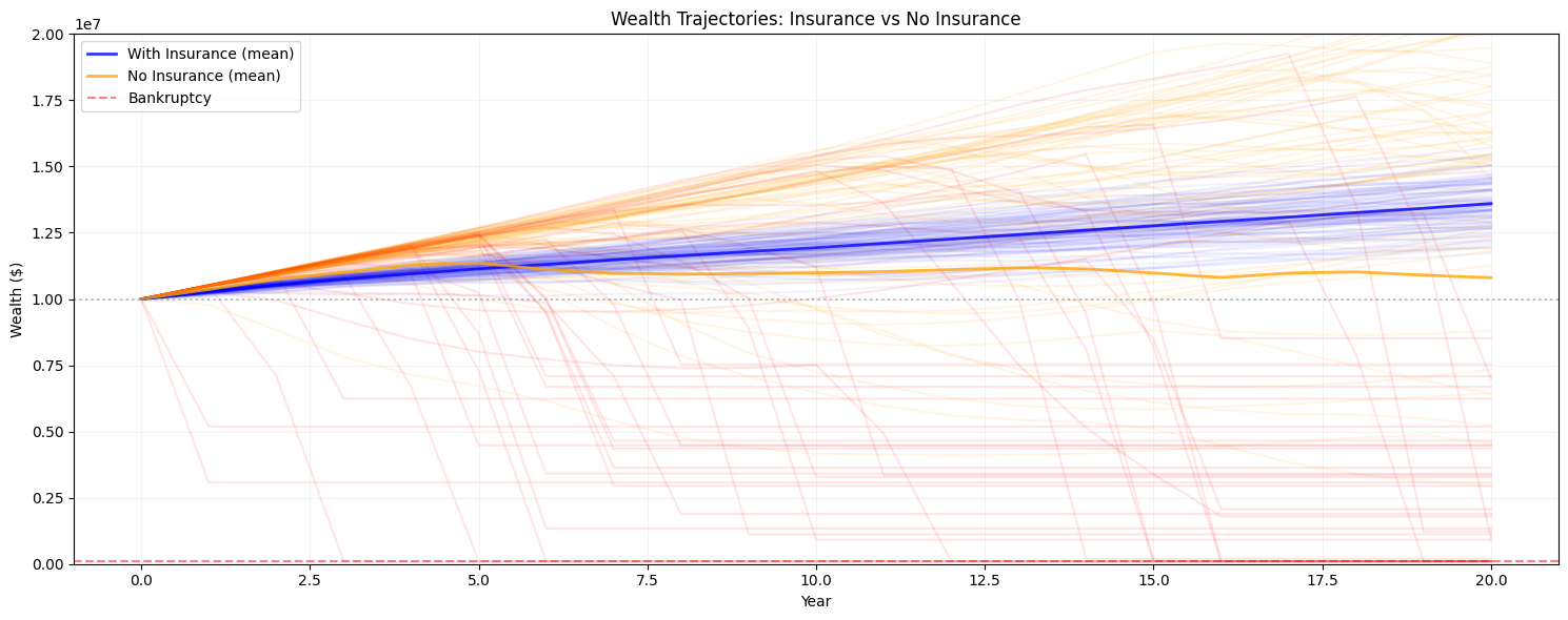 The graph above shows a 20-year simulation comparing wealth trajectories with and without insurance. Notice how insurance provides protection during catastrophic loss years (marked with orange lines), preventing bankruptcy and enabling steady long-term growth.